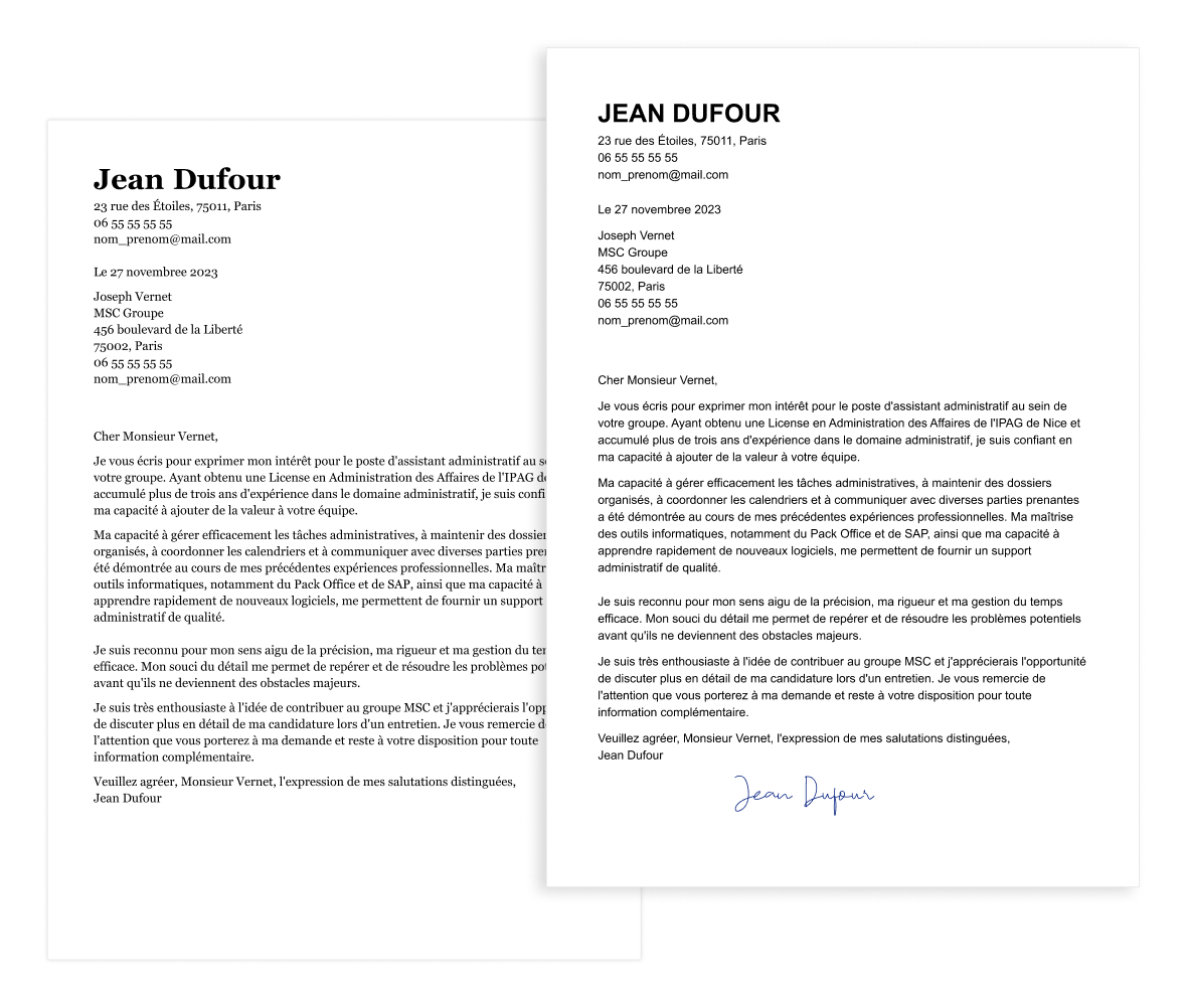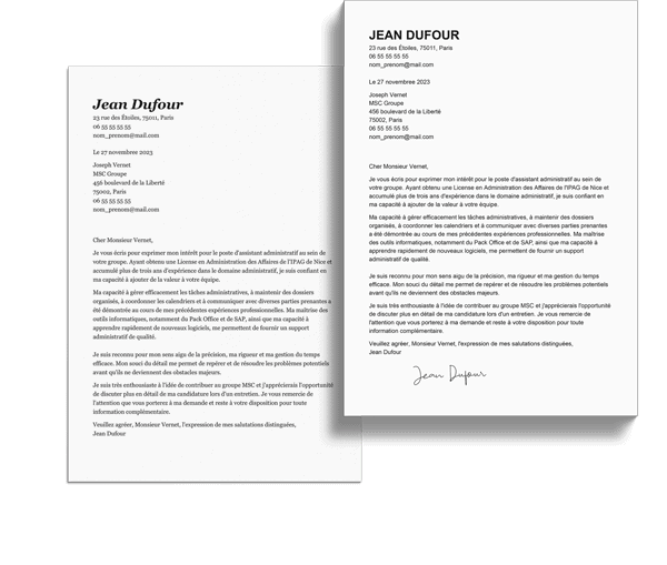 Les responsables du recrutement s’attendent à voir une lettre de motivation qui accompagne votre exemple de CV assistant administratif, même si l’offre d’emploi ne le mentionne pas. Vous aurez ainsi la possibilité d’y inclure davantage d’éléments sur votre profil et votre parcours professionnel. Consultez notre guide dédié si vous ne savez pas quoi mettre dans une lettre de motivation.