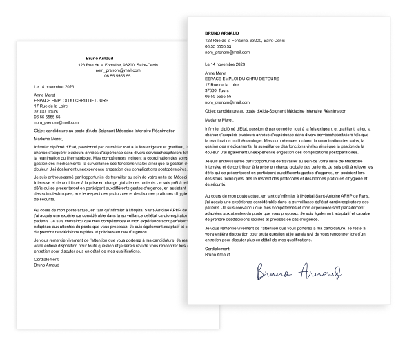 Voilà, vous savez maintenant comment faire une lettre de motivation et votre lettre de motivation d’infirmier sera bientôt terminée ! N’oubliez pas, comme dans cet exemple, d’inclure une formule de politesse qui peut aussi inviter le responsable des ressources humaines à vous contacter pour un potentiel entretien d’embauche.