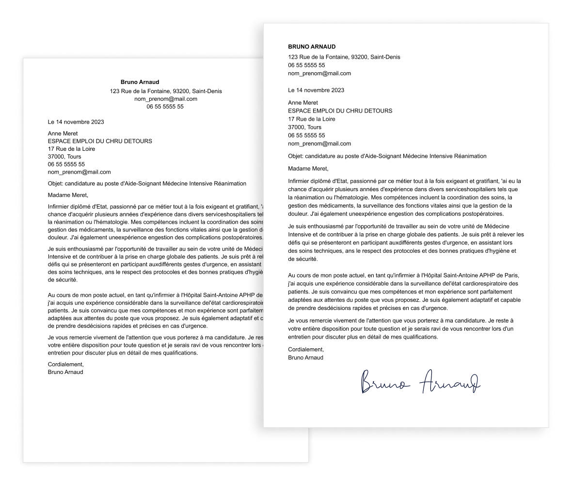 En effet, dans les métiers de la santé, la ponctualité est un élément important pour la santé des patients. Si vous connaissez le nom du recruteur, n’hésitez pas à l’utiliser ainsi que le nom de l’établissement de santé pour lequel il travaille.